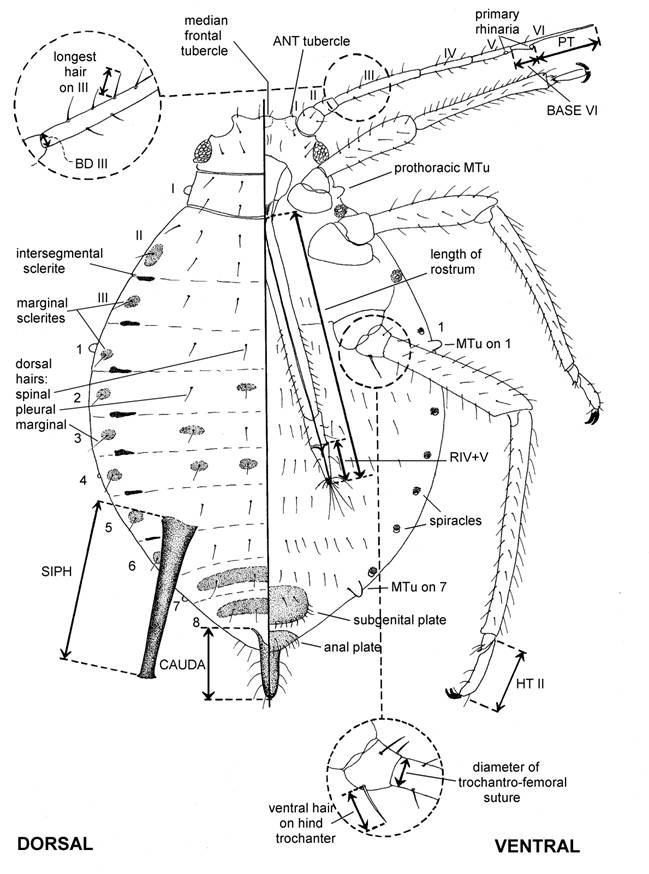 Fig. 1. Diagrammatic illustration of an apterous vivipara of a member of the tribe Aphidini showing dorsal (L) and ventral (R) morphological features used in the keys in this book, the abbreviations used, and ways to measure certain morphometric parameters. Antennal (ANT) and thoracic segments are numbered I-VI and I-III respectively, ANT III onwards being the ANT flagellum, and ANT VI comprising BASE and processus terminalis (PT). The ratio of ANT VI BASE to PT (ANT PT/BASE) is a frequently used discriminant. Abdominal segments are numbered 1-8. Insets show measurements of ANT and trochantral hairs, basal diameter of ANT III (BD III) and diameter of trochantro-femoral suture. The last two segments of the rostrum usually form a combined structure (R IV+V), the length of which is often compared with that of the 2nd segment of the hind tarsus (HT II). Members of the tribe Aphidini typically have marginal tubercles (MTu) on the prothorax and abdominal tergites (ABD TERG) 1 and 7, but some have them also on other segments.