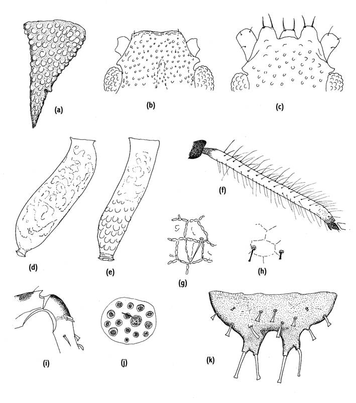 Fig.18 Apterae on Carex I; (a) SIPH of Acutosiphon obliquoris, (b) Front of head of Vesiculaphis caricis, (c) Front of head of Vesiculaphis theobaldi, (d) SIPH of V. caricis, (e) SIPH of Carolinaia caricis, (f) Hind tibia of Schizaphis caricis, (g) Part of spinal cuticle of ABD TERG 3 of Schizaphis pilipes, (h) Same for Schizaphis wahlgreni, (i) Base of tibia (“patella”) of Saltusaphis scirpus, (j) Dorsal wax gland of Sminthuraphis ulrichi, (k) ABD TERG 8 of Saltusaphis scirpus.