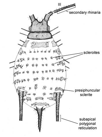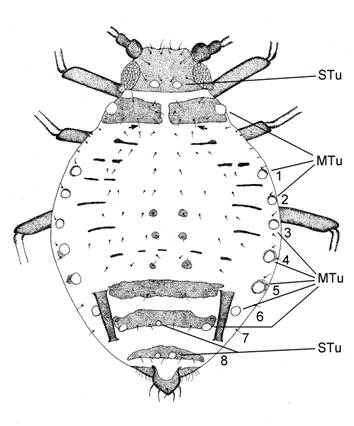 Fig. 2 Dorsal facies of apterous viviparae representative of two large genera of Macrosiphini, to show additional morphological features referred to in the keys. (a) A Dysaphis species (D. radicola), showing a typical distribution of marginal and spinal tubercles (MTu and STu). Arrows indicate a pair of pleural hairs on the posterior margin of the pronotum that are characteristic of the devecta species group. (b) A member of Uroleucon (subgenus Uromelan), showing features typical of this and related genera.