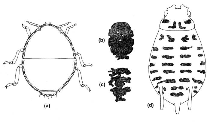 Fig.25 Apterae on Cymbidium and other orchid genera; (a) Dorsal body of Cerataphis orchidearum, (b) Dorsal abdominal patch of Sitobion luteum, (c) Dorsal abdominal patch of S. indicum, (d) Dorsal markings of Neomyzus dendrobii.