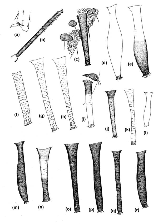 Fig.43 Apterae on Polypodium and other ferns; (a) End of hind tibia and tarsus of Shinjia pteridifoliae, (b) ANT III of Papulaphis sleesmani, (c) SIPH anhd surrounding cuticle of Macromyzus woodwardiae, (d) SIPH of Amphorophora scabripes, (e) SIPH of A. ampullata, (f) SIPH of Macrosiphum adianti, (g) SIPH of M. clydesmithi, (h) SIPH of M. pteridis, (i) SIPH, presiphuncular sclerite and a dorsal hair of Idiopterus nephrelepidis, (j) SIPH of Micromyzodium polypodii, (k) Micromyzus niger, (l) SIPH of Taiwanomyzus filicis, (m) SIPH of T. alpicola, (n) SIPH of Myzus filicis, (o) SIPH of Micromyzella sleonensis, (p) SIPH of M. pterisoides, (q) SIPH of M. kathleenae, (r) SIPH of Micromyzus katoi.