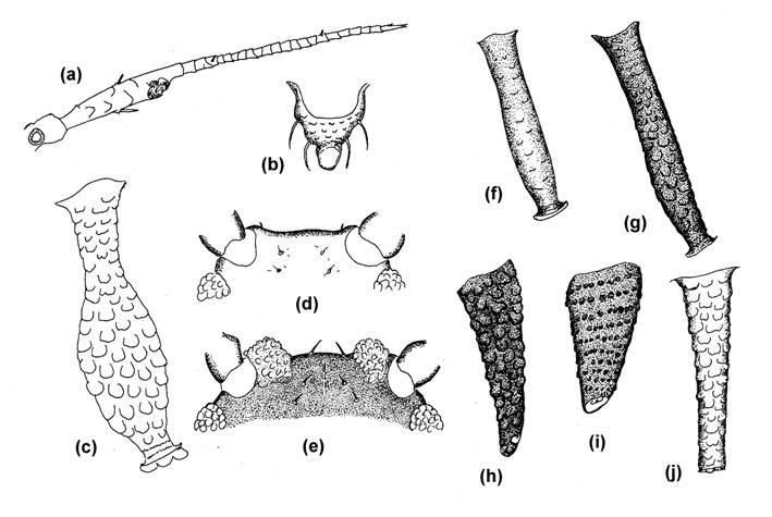 Fig.44 Apterae on Polytrichum and other mosses; (a) ANT VI of Muscaphis musci, (b) Cauda of Muscaphis musci, (c) SIPH of Decorosiphon corynothrix, (d) Front of head of Pseudacaudella rubida, (e) Front of head of Myzodium modestum, (f) SIPH of Pseudacaudella rubida, (g) SIPH of Myzodium modestum, (h) SIPH of Muscaphis escherichi, (i) SIPH of Muscaphis utahensis, (j) SIPH of Muscaphis musci.
