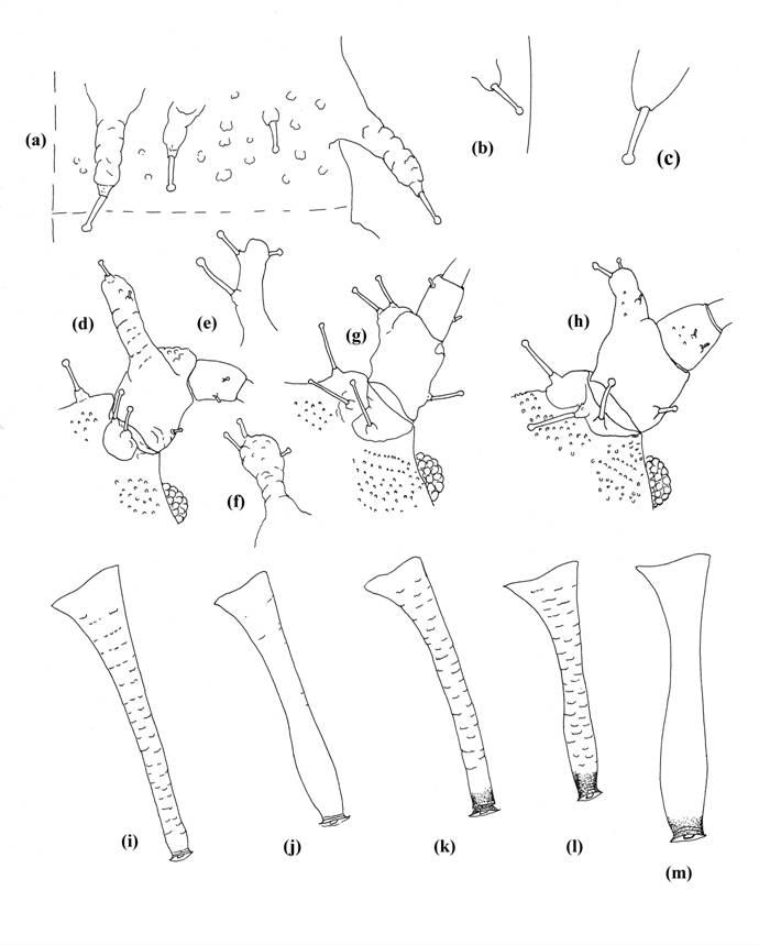 Fig.47 Apterae of Matsumuraja on Rubus; (a) ABD TERG 3 (right side) of Matsumuraja rubicola, (b) Marginal hair on ABD TERG 3 of M. rubi, (c) Spinal hair on ABD TERG 3 of M. capitophoroides, (d) ANT I and II of M. rubiphila, (e) Projection on ANT I of M. capitophoroides, (f) Projection on ANT I of Matsumuraja sp. with 2n=18, BMNH, Queensland, (g) ANT I and II of M. sorini, (h) ANT I and II of M. rubifoliae, (i) SIPH of M. rubea, (j) SIPH of M. taisetsusana, (k) SIPH of M. hirakurensis, (l) SIPH of M. rubifoliae, (m) SIPH of M. sorini.