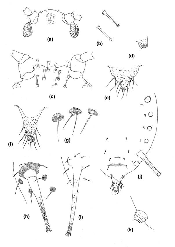 Fig. 5 Apterae on Achillea; (a) Front of head of Coloradoa achilleae, (b) Dorsal body hairs of Coloradoa santolinae, (c) Front of head of Pleotrichophorus patonkus, (d) SIPH of Microsiphum millefolii, (e) Cauda of Microsiphum millefolii, (f) Cauda of Metopeurum fuscoviride, (g) Scleroites of Macrosiphoniella millefolii, (h) SIPH of Macrosiphoniella sejuncta, (i) SIPH of Macrosiphoniella tapuskae, (j) Abdomen of Aphis vandergooti showing MTu, SIPH and cauda, (k) SIPH of Aphis oligommata.