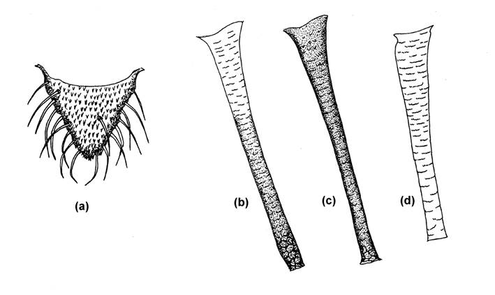 Fig.57 Apterae on Vernonia; (a) Cauda of Protaphis evansi (type), (b) SIPH of Sitobion congolense (type), (c) SIPH of S. nigeriense (type), (d) SIPH of Aphis vernoniae.