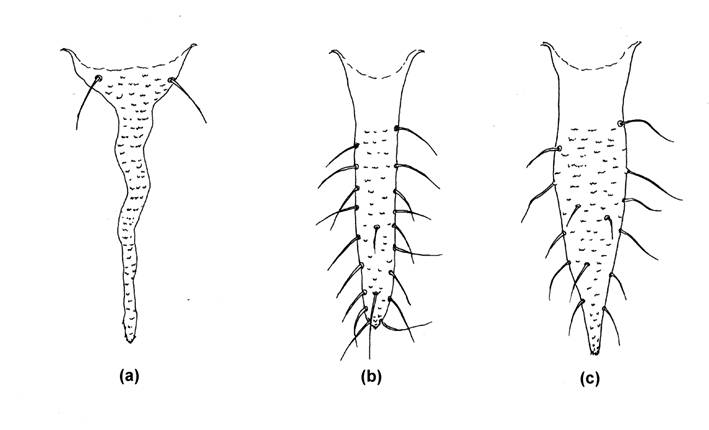 Fig. 7 Apterae on Adenophora; (a) Cauda of Tshernovaia adenophorae, (b) Cauda of Uroleucon triphyllae, (c) Cauda of U. adenophorae.